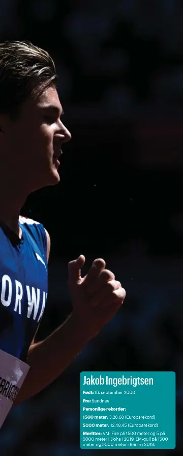 Under em i berlin i 2018 tok han gull på både 1500 meter og 5000 meter. I firenze løper han 5000 meter. I firenze satte nordmannen europeisk rekord på distansen med tiden 12.48,45, men det er likevel øvelsen han «bare» er verdens tredje raskeste på i år, 1500 meter, han løper i ol. Karsten warholm sjokkerte da han løp 400m hekk under 46 sekunder. Han sto på listene over aktuelle deltakere både på 800 meter, 1500 meter, 5000 meter, 10.000 meter og 3000 meter hinder. I en pressemelding fra friidrettsforbundet går det frem at valget skyldes det tette programmet mellom distansene. Og så klokken 22:30 skal håvard haukenes ut å gå 50km. Det melder norges friidrettsforbund i en pressemelding. Det setter jeg høyt, å være det år etter år, det er det vi jobber etter, svarer filip mangen ingebrigtsen som sammen med jakob løper 1500 meter. Jakob ingebrigtsen er påmeldt også på 5000 meter, men kombinasjonen 1500/5000 er ikke praktisk mulig å gjennomføre. Jakob ingebrigtsen (20) velger å løpe 1500 meter, og ikke 5000 meter, i ol. Brødrene jakob og filip ingebrigtsen løper begge 1500 meter i ol. Jakob er trent for å løpe 56 sekunder på hver 400 meter.